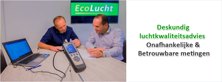 Een professionele luchtkwaliteitsmeting is de 1e stap om gezondheidsrisico's te inventariseren. En het effect te meten van de luchtzuiverende initiatieven. Meten = weten. De Ecolucht adviseur komt bij langs u met gekalibreerde meetapparatuur en geeft objectief advies met concrete oplossingen: